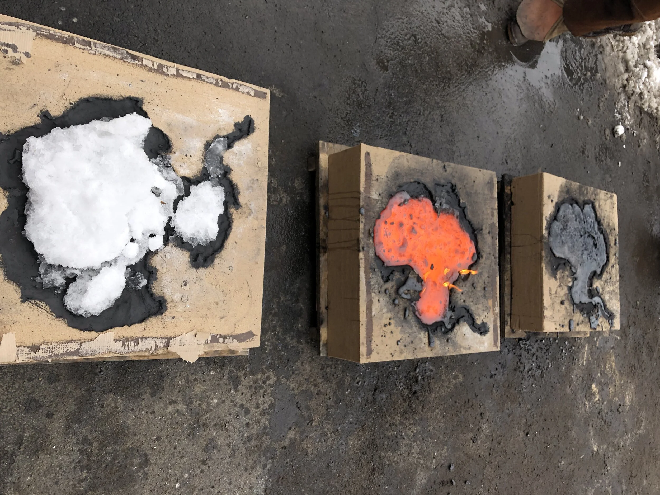 An iron pour is a community of people who respect and listen to one another. Most people can agree that the entire word should be like that, and that when globally there is an issue we need to work together to fix it. The melting of the polar ice caps is a problem that will effect everyone in the world, and I used an iron pour to represent that. I made topographical sand molds of Antarctica that I packed with ice before the molten iron was poured into them. The steam and rapid disappearance of the packed ice is an accelerated view of what will happen to the north and south pole is something is not done to help.